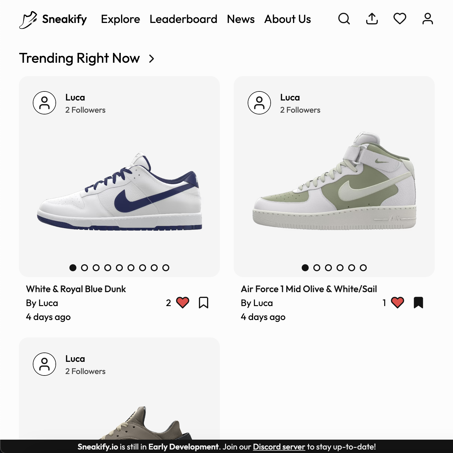Sneakify is essentially a social media platform, similar to Instagram, but specifically for custom Nike By You sneakers. Our primary goal was to create a user-friendly experience where people could easily upload their custom sneaker designs for others to explore, and potentially purchase if they liked them.